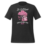 This "In October Even Witches Wear Pink - Breast Cancer Awareness" t-shirt is everything you've dreamed of and more. It feels soft and lightweight, with the right amount of stretch. It's comfortable and flattering for both men and women.• 100% combed and ring-spun cotton (Heather colors contain polyester)